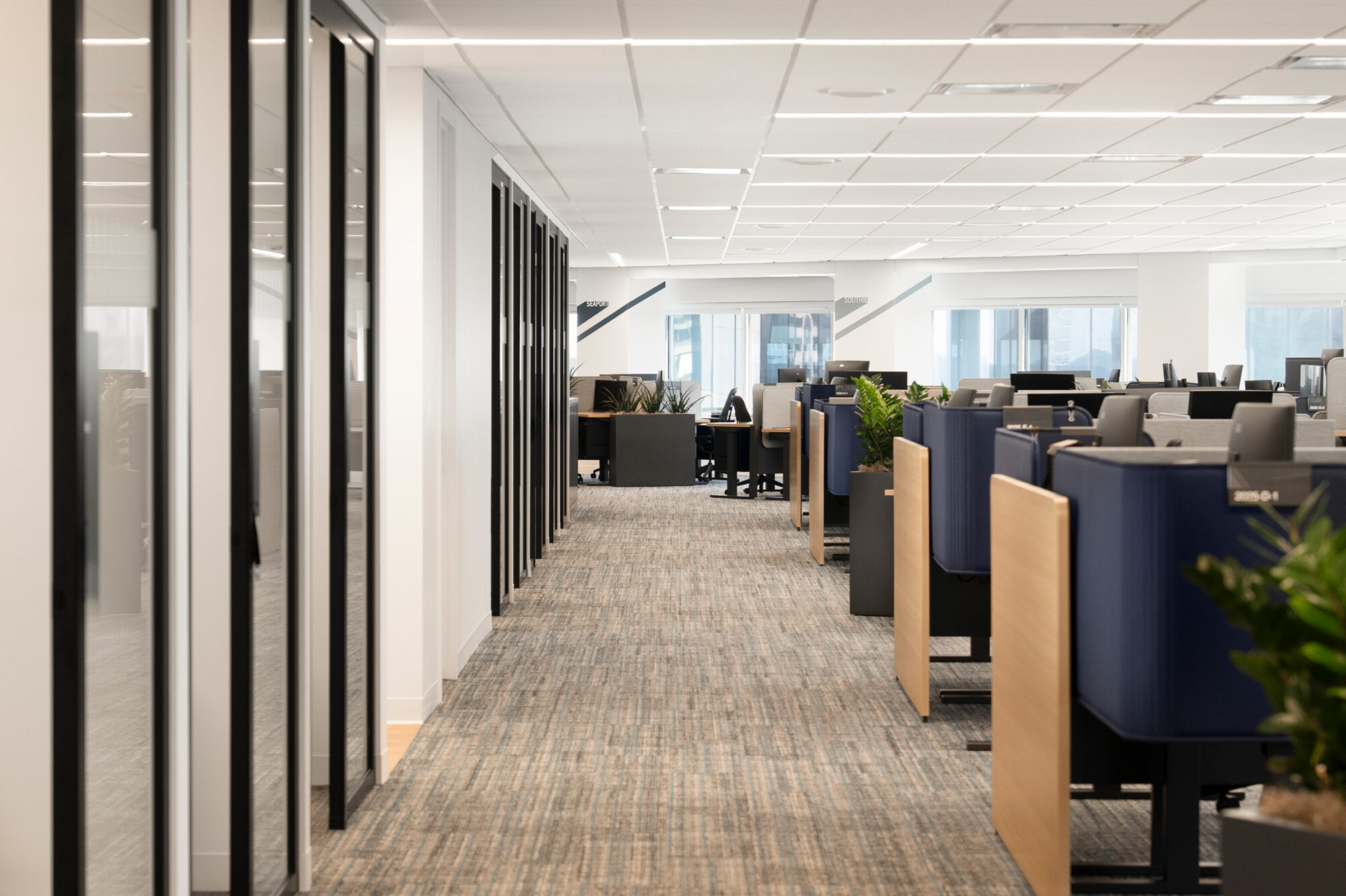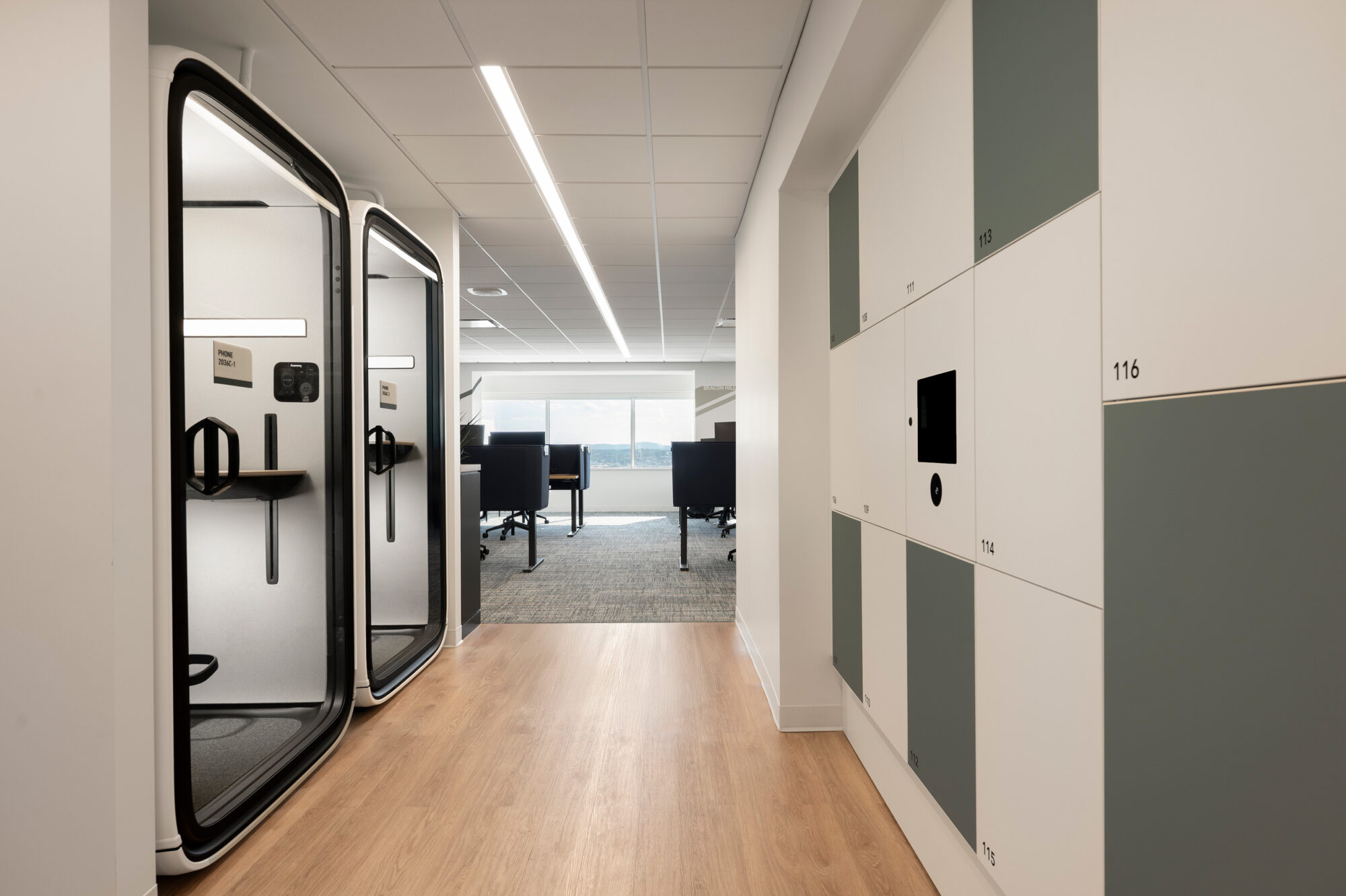 Work areas are thoughtfully designed to balance flexibility and focus. Employees can choose from reservable micro-offices, open workstations, agile seating zones, and private phone pods each tailored to the diverse needs of hybrid work.