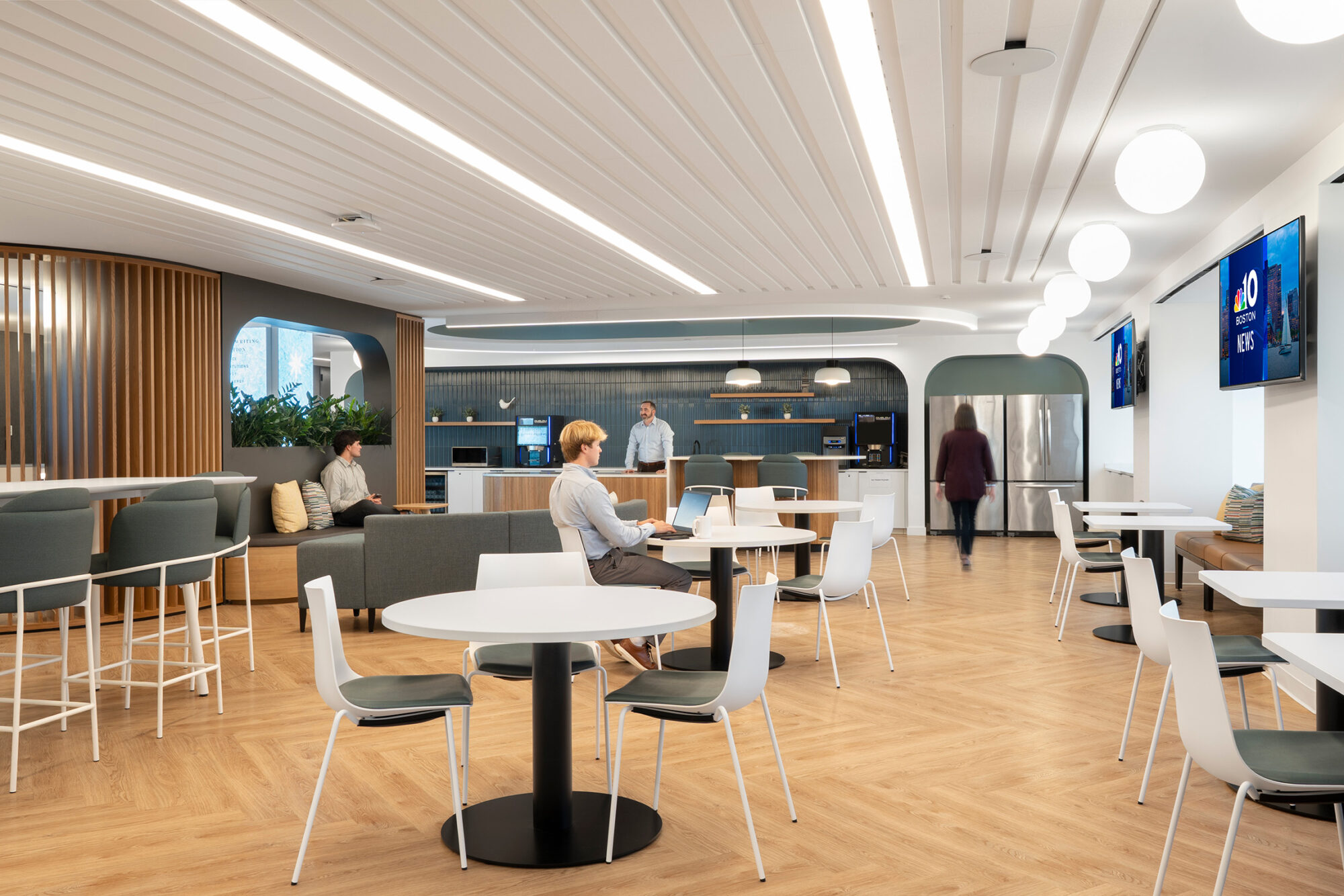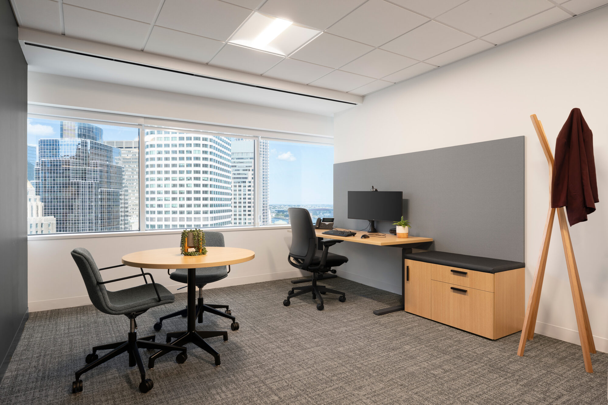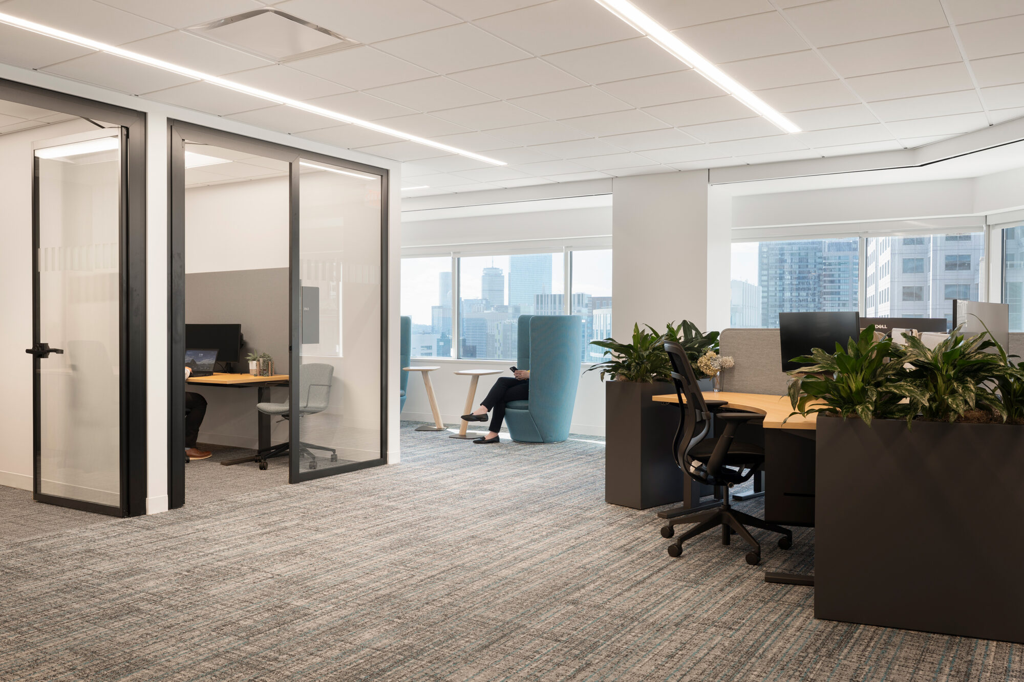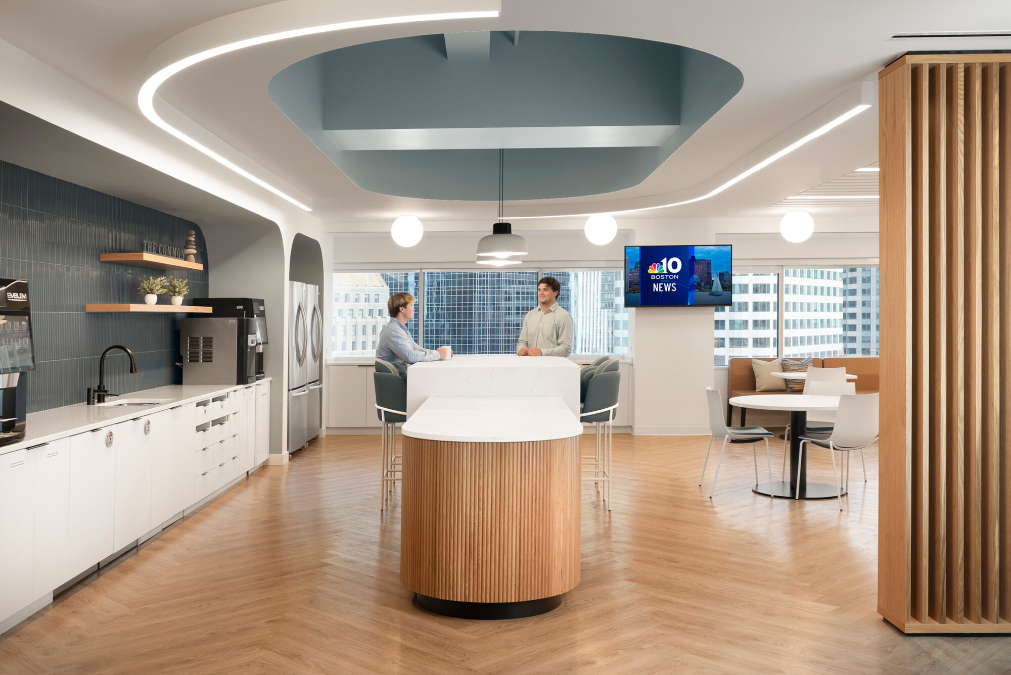Our Corporate Studio recently completed a new corporate office in Downtown Boston’s One Financial Center, adjacent to South Station. Our client, a world leader in insurance and risk management, embraced consolidation into a single, 26,000-square-foot space as an opportunity to design a workplace that fully supports its evolving hybrid model.