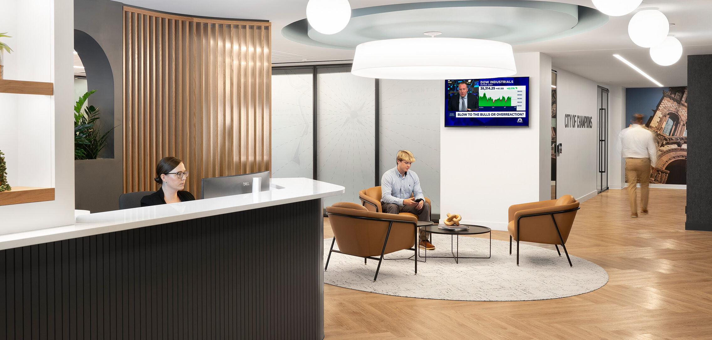The office opens with a welcoming reception and canteen area that serves as a central hub for connection, collaboration, and community. This space seamlessly flows into a large training room, designed to accommodate town halls and larger gatherings, reinforcing a culture of openness and engagement.