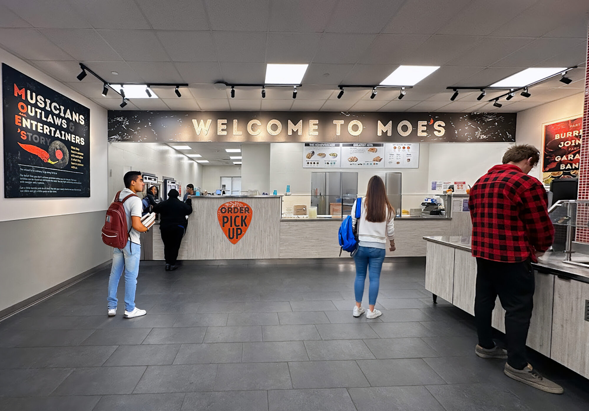 Anchored by Moe’s Southwest Grill, the design transforms a traditional dining environment into a flexible, student-centered hub. Thoughtful spatial planning prioritizes clear circulation and intuitive flow, while an abundance of natural light creates an open, energizing atmosphere throughout the day.